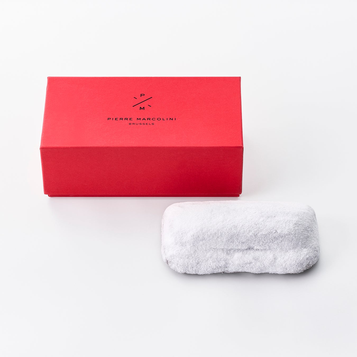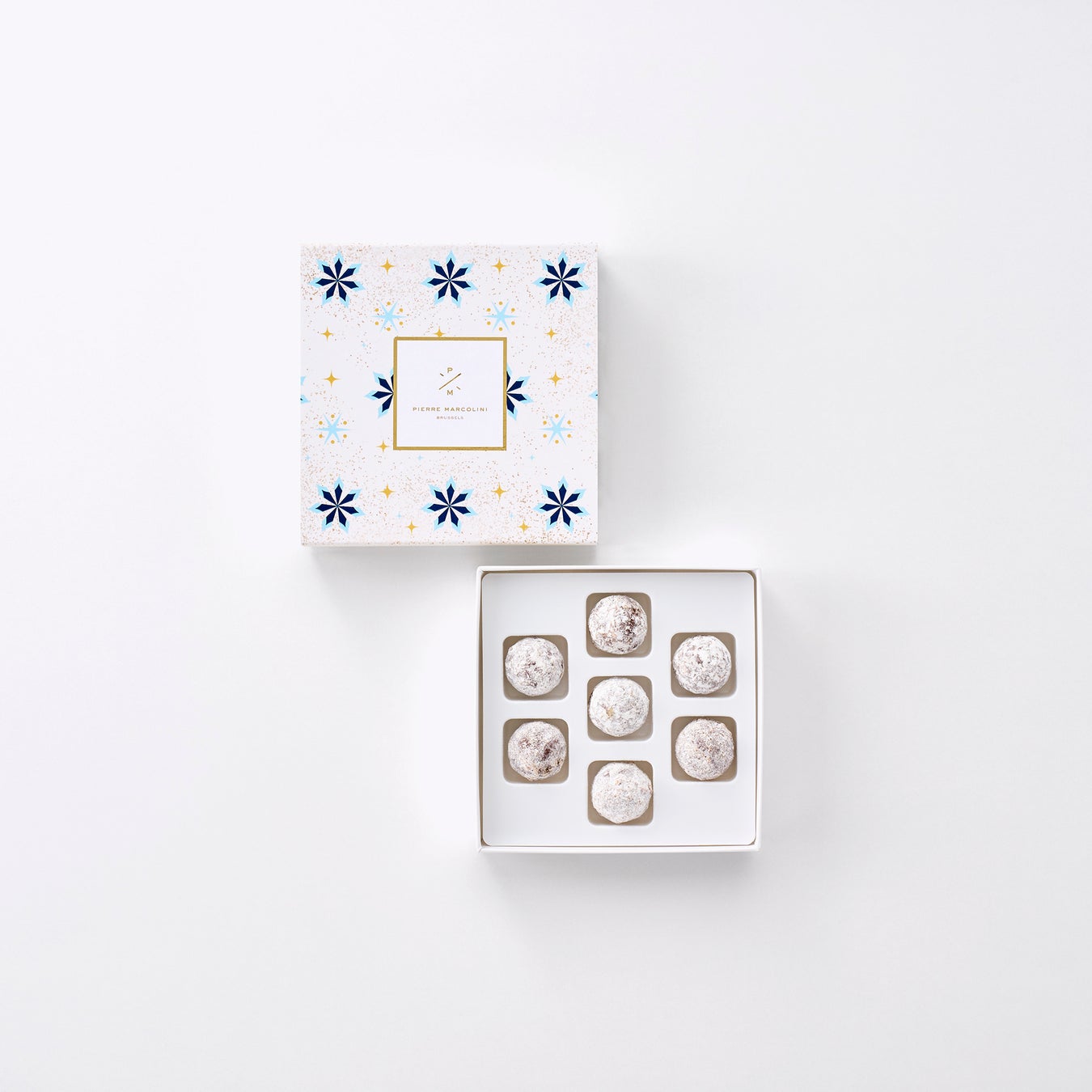 ビターチョコレートの中にマール ドゥ シャンパーニュで香り付けした滑らかなガナッシュを詰め、白いパウダーシュガーを纏わせた大人のトリュフです。