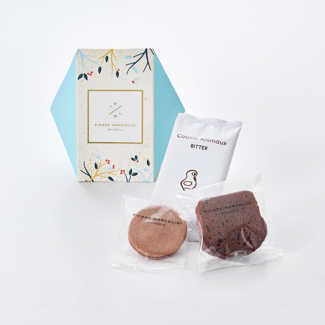 ピエール マルコリーニのクーベルチュールを使って焼き上げた濃厚な「ケーク ショコラ」、さくさくの「サブレ ショコラ」、人気の「クッキー アニモ ビター」をホリデーシーズン限定パッケージに詰めました。