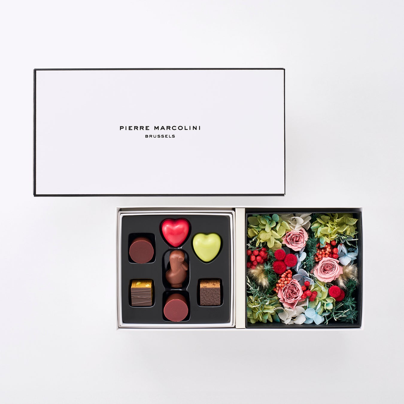 ホリデーシーズンのテーマカラーでアレンジしたプリザーブドフラワーと、人気のチョコレートが入ったセレクション7個入りを組み合わせたギフトセット。