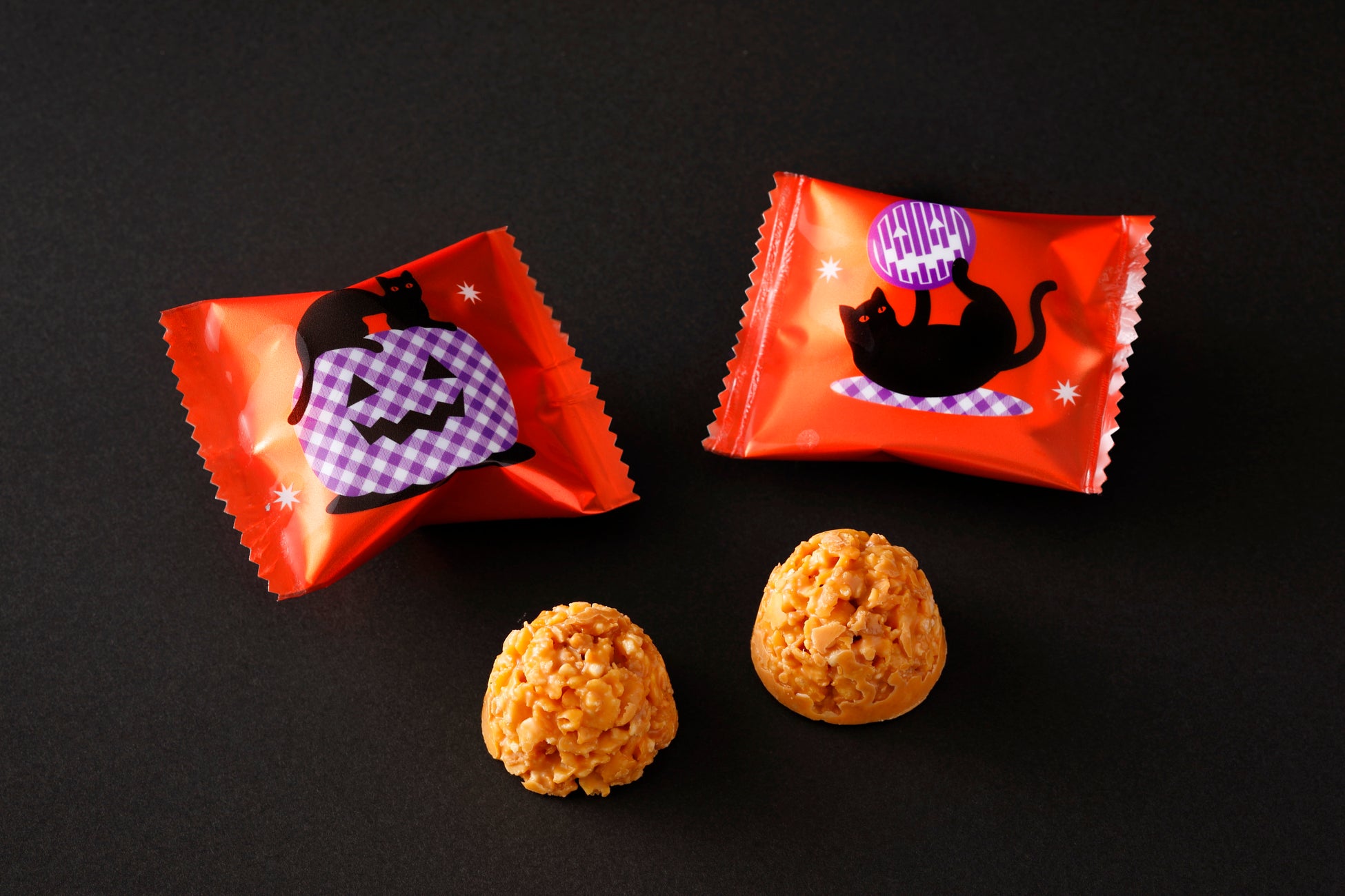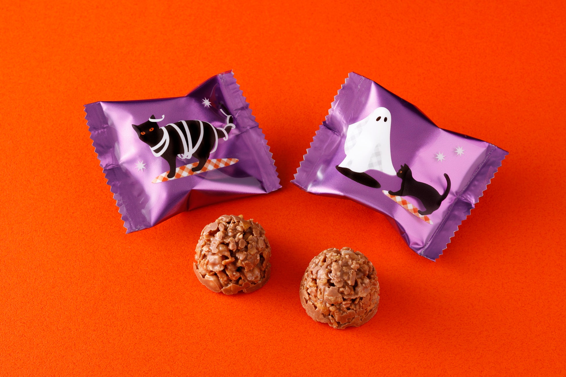 いたずら大好きな猫たちが、ハロウィンのおばけたちに得意のいたずらを仕掛けているイラストが描かれた今年の『ハロウィンショコラ』。自由に遊びまわる猫たちに、おばけたちもタジタジの様子です。ハロウィンの雰囲気が伝わってくるような可愛らしいパッケージに3種のクランチチョコレートを詰め合わせた『ハロウィンショコラ』は、大切なご友人へのギフトとしてはもちろん、ご家族との団らんの時間に味わっていただきたい秋のおすすめスイーツです。