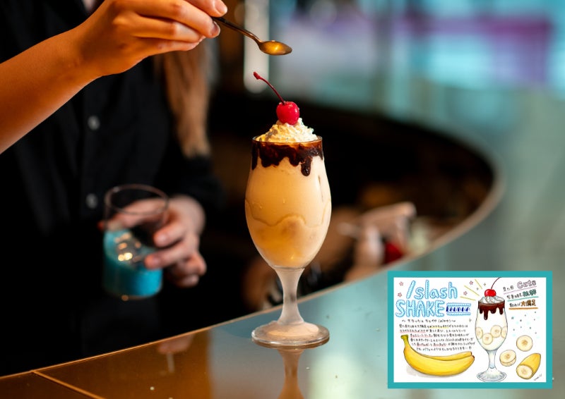 本イベントが開催される11月1日限定スペシャルデザートとして、バナナスプリットをご用意。甘く熟したバナナに濃厚なチョコレートソース、アイスクリームとクリーム、そしてチェリーの甘美なコントラストが奏でる一皿です。izumi氏の描いたフードアートがどのように再現されたかは当日のお楽しみ。様々なアートが行き交う空間で、イラストのフードが現実世界で再現された、食で楽しむアートを存分にお楽しみください。