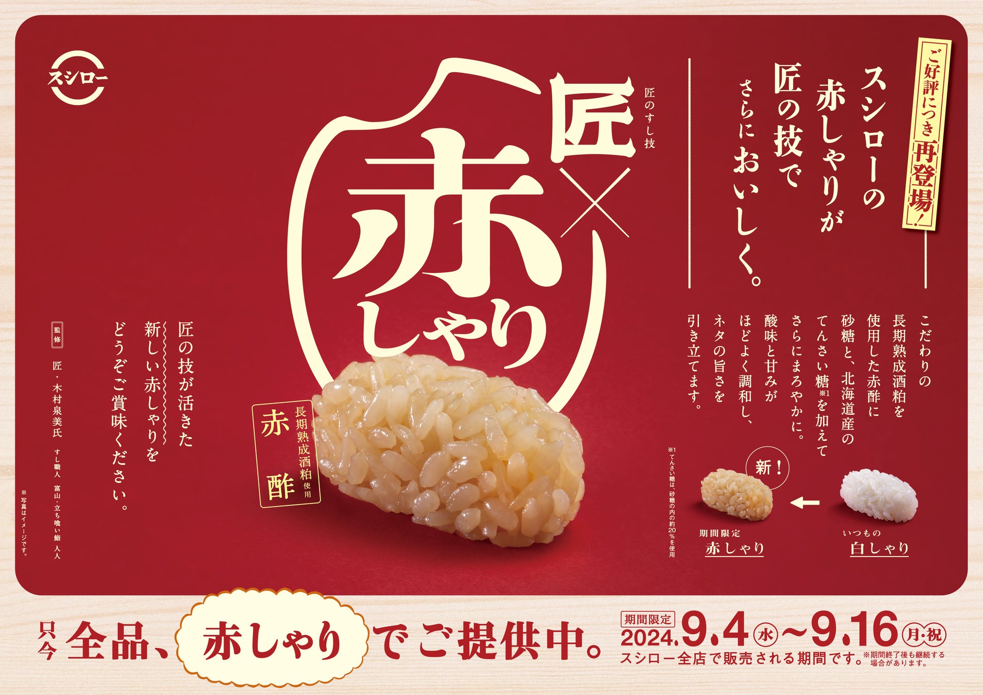 『ネタの旨さを引き立てる匠の赤しゃり×天然魚』開催期間中は、富山の立ち喰い鮨「人人(じんじん)」の木村泉美さんとともに開発した匠の赤しゃりでご提供させていただきます。ぜひ全国のスシローでお楽しみください。