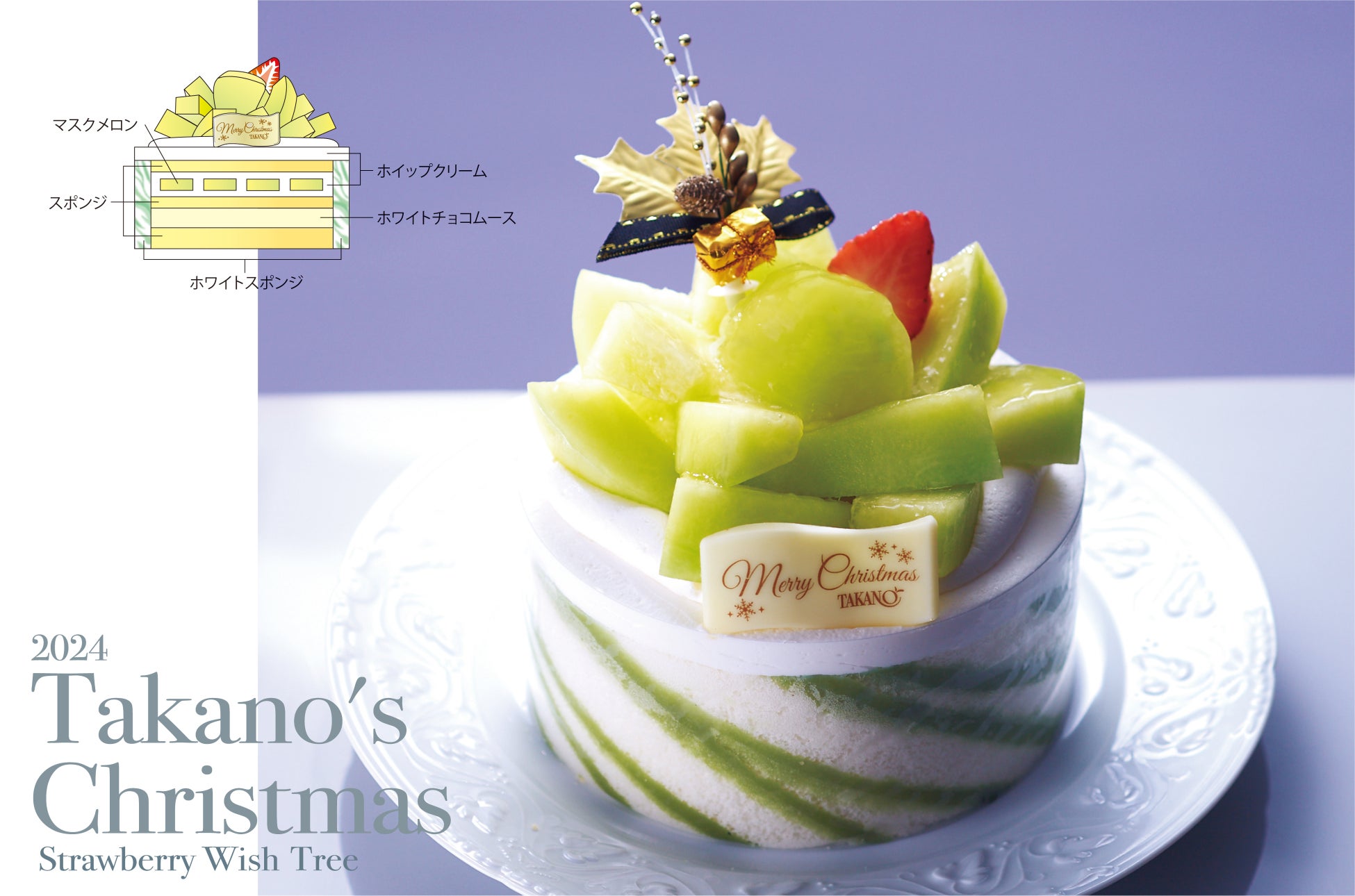 きめ細やかなスポンジでホワイトチョコムース、マスクメロン、口どけのよいホイップクリームをサンド。メロン風味の模様が入ったホワイトスポンジで巻きマスクメロンをあふれんばかりにトッピングしました。