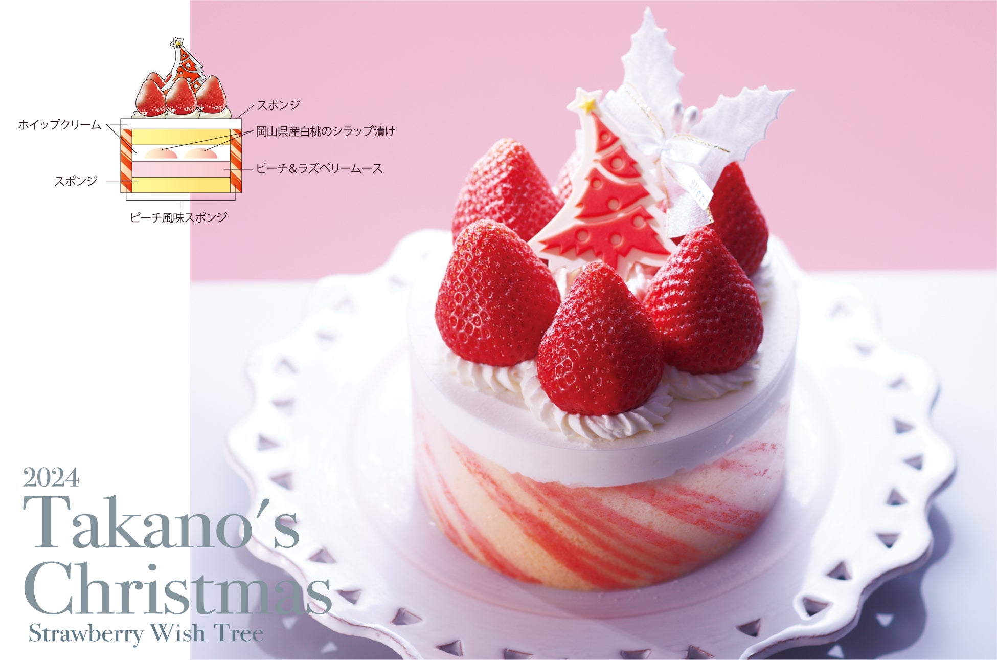 苺風味の模様が入ったピーチ風味スポンジの内側にはなめらかなピーチ&ラズベリームース、岡山県産白桃のシラップ漬けを重ねました。いくつもの美味しさが口の中でほどけます。