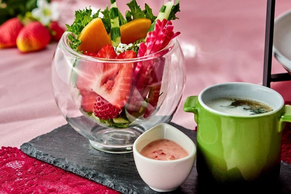 ウェルカムプレートには、フルーティーな味わいが特徴の苺ドレッシングを神奈川近郊の季節の野菜にかけて楽しめる色鮮やかな一皿と、しいたけ香るモロヘイヤのなめらかなスープをご用意いたします。
