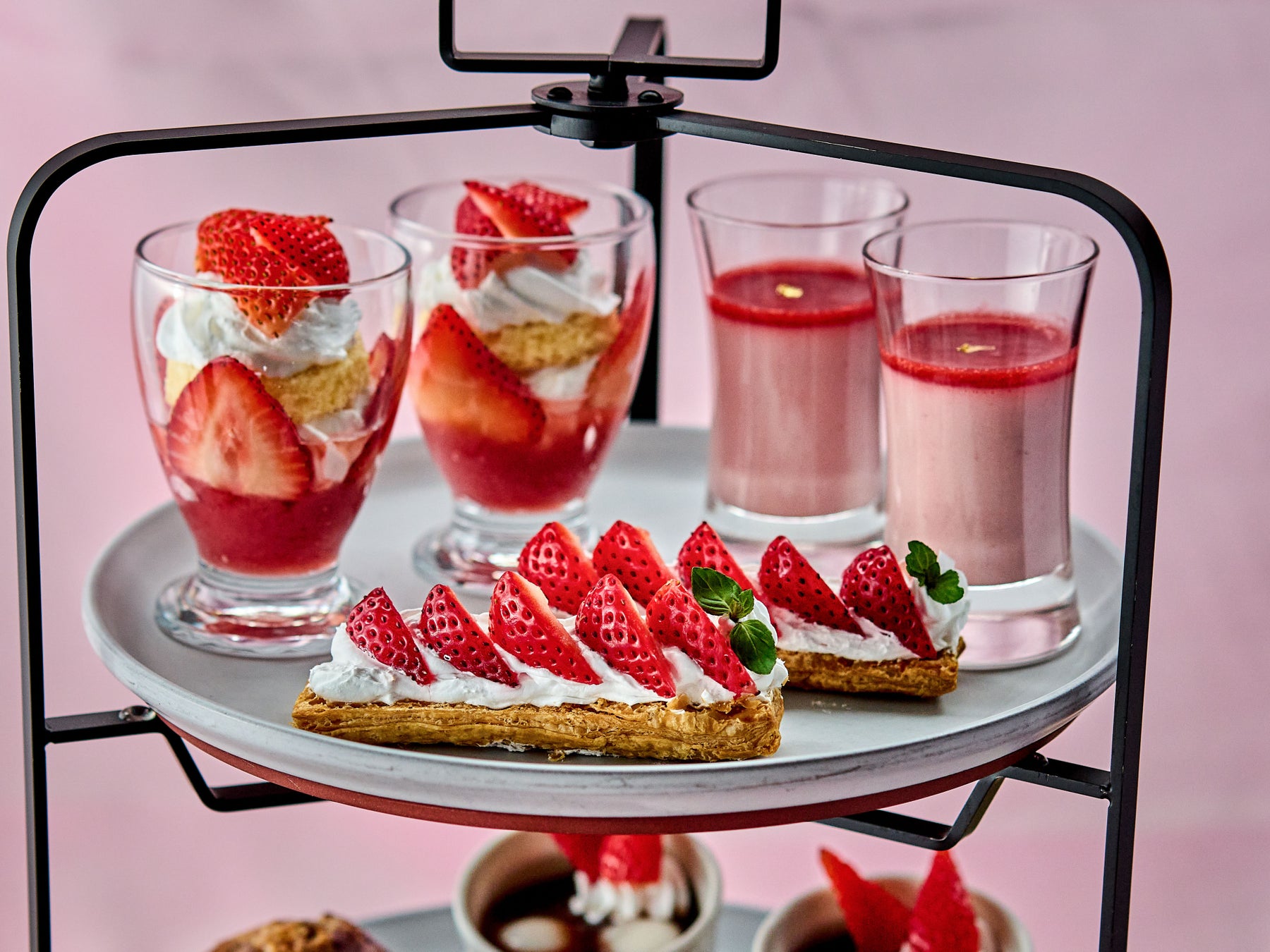 スイーツは、苺のショートケーキをグラスに閉じ込めたオリジナルのミニパフェをはじめ、サクサク食感のパイの上になめらかなカスタードクリームと苺を乗せた苺のスティックパイ、和と苺の調和を楽しめる冷ぜんざいなど、苺が口いっぱいに広がる贅沢なラインアップとなっております。