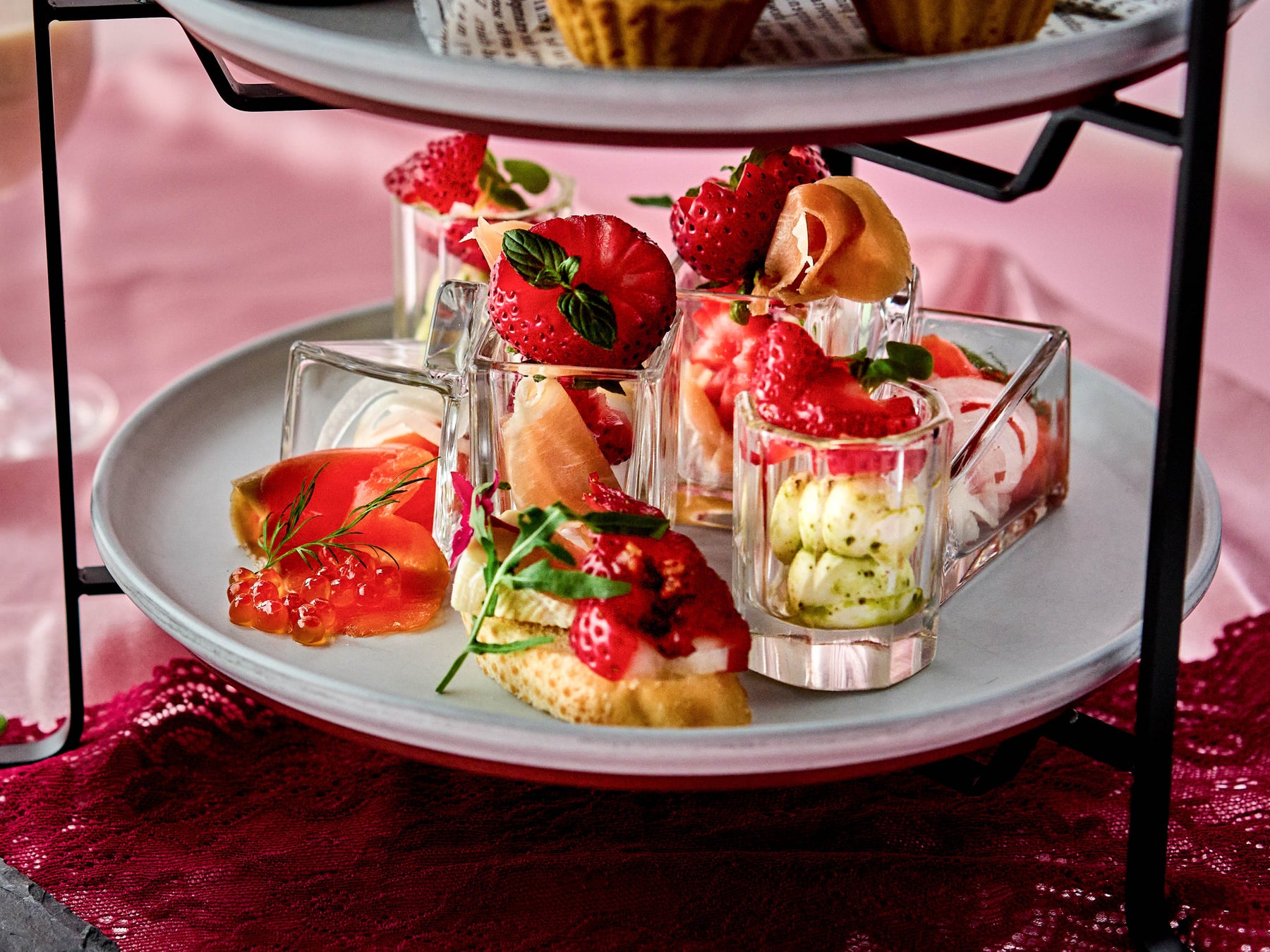 セイボリーは、苺の酸味とモッツァレラチーズのミルキーな味わいが絶妙にマッチした、見た目にも華やかな苺のカプレーゼや、ミント風味で爽やかに仕上げたクセになる味わいのスペイン産生ハムと苺のマリネをご用意し、甘みと酸味、塩味のバランスがとれた内容となっております。